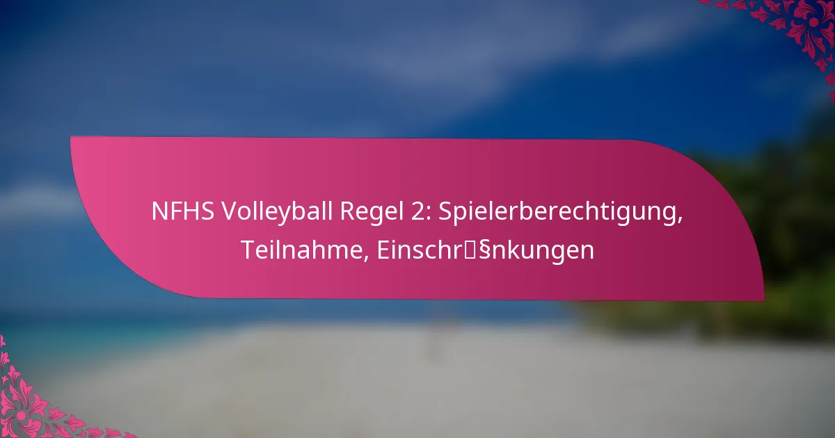 Die NFHS-Volleyballregeln legen klare Kriterien für die Spielerberechtigung und -teilnahme fest, die sich auf Alter, Klassenstufe, akademische Standards, Wohnsitz und Transferimplikationen konzentrieren. Diese Richtlinien sind entscheidend für die Aufrechterhaltung eines fairen Wettbewerbs und die Sicherheit der Athleten, da sie auch Einschränkungen in Bezug auf frühere Erfahrungen und Gesundheit beinhalten. Das Verständnis dieser Regeln ist für Spieler, Trainer und Schulen von entscheidender Bedeutung, um die Einhaltung sicherzustellen und die Teilnahmechancen zu erhöhen.